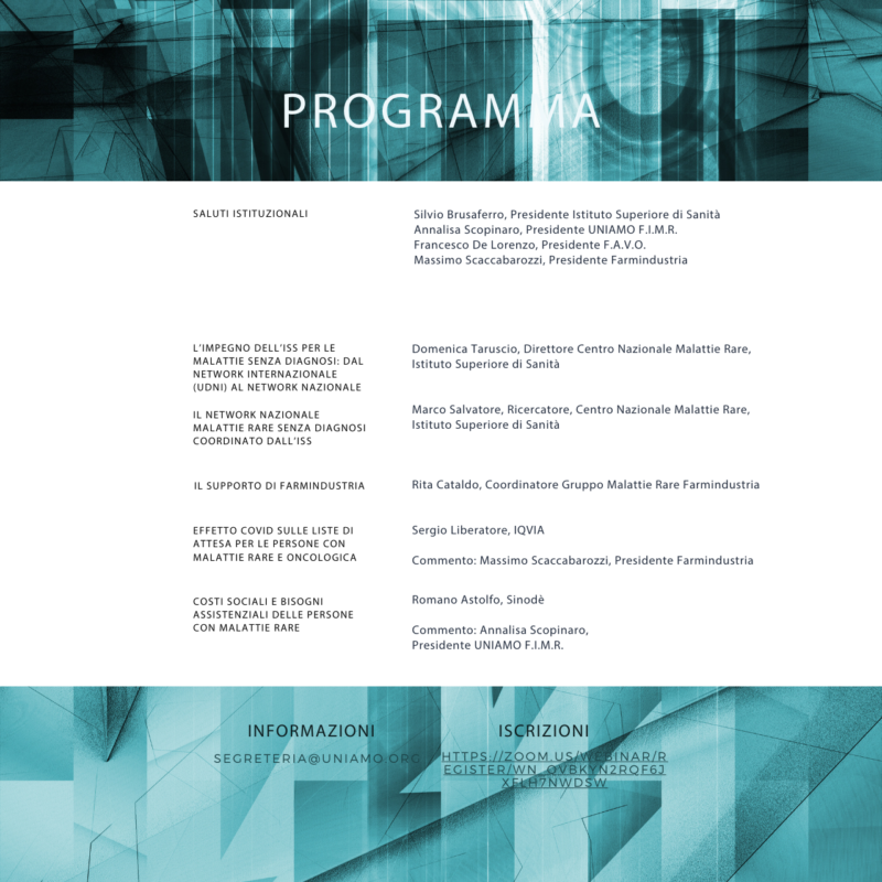 L’evento vuole approfondire l’impegno dell’ISS e di UNIAMO per le malattie rare, con un focus speciale sulle non diagnosticate e sulle difficoltà legate al Covid.
