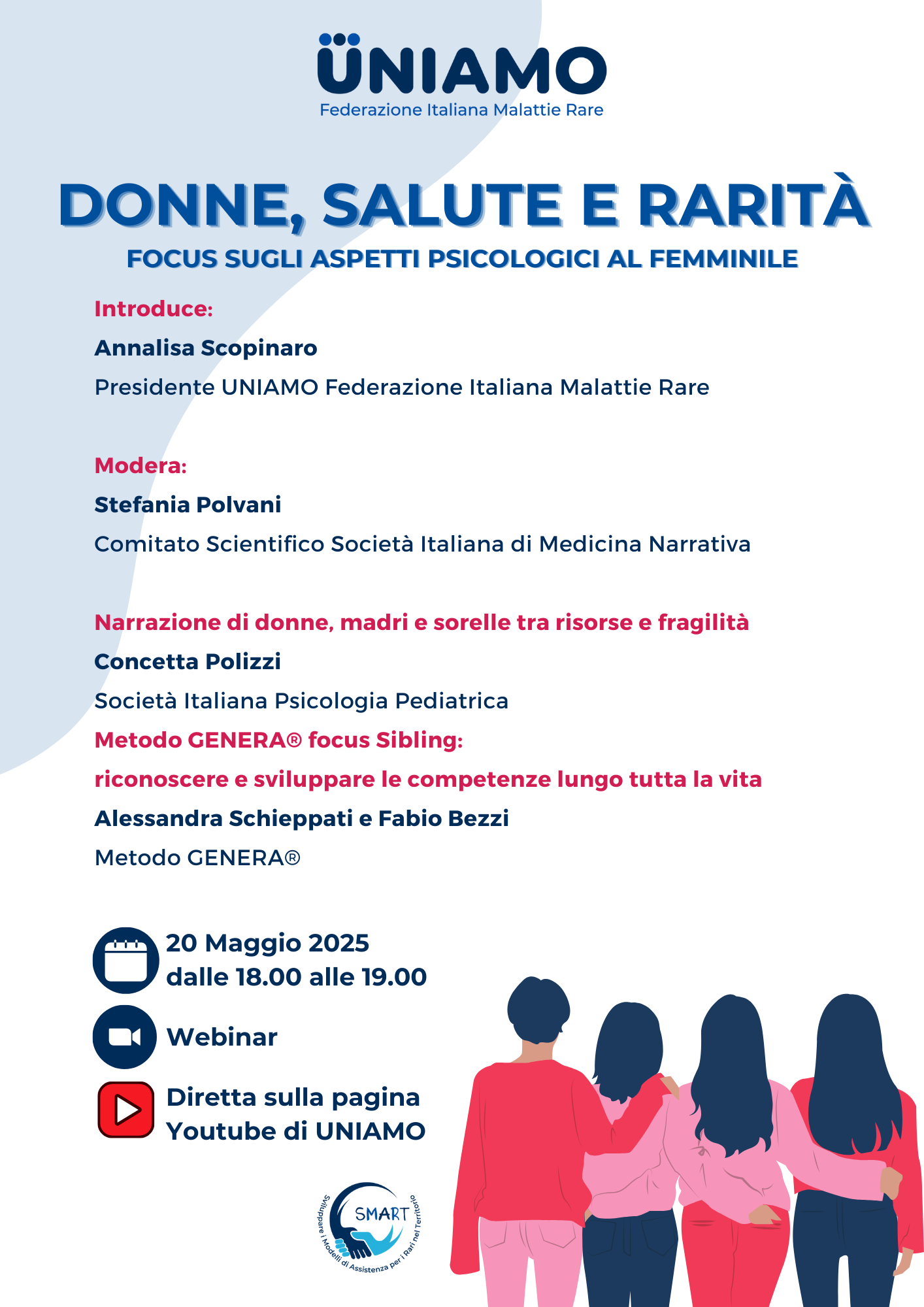 Il 20 maggio alle ore 18:00 un nuovo appuntamento con Donne, Salute e Rarità, il progetto di UNIAMO Federazione Italiana Malattie Rare dedicato alla medicina di genere e al diritto alla salute delle ragazze e delle donne con malattia rara, siblings e caregiver. L’incontro, moderato da Stefania Polvani, Comitato Scientifico Società Italiana di Medicina Narrativa, sarà dedicato alla salute mentale.