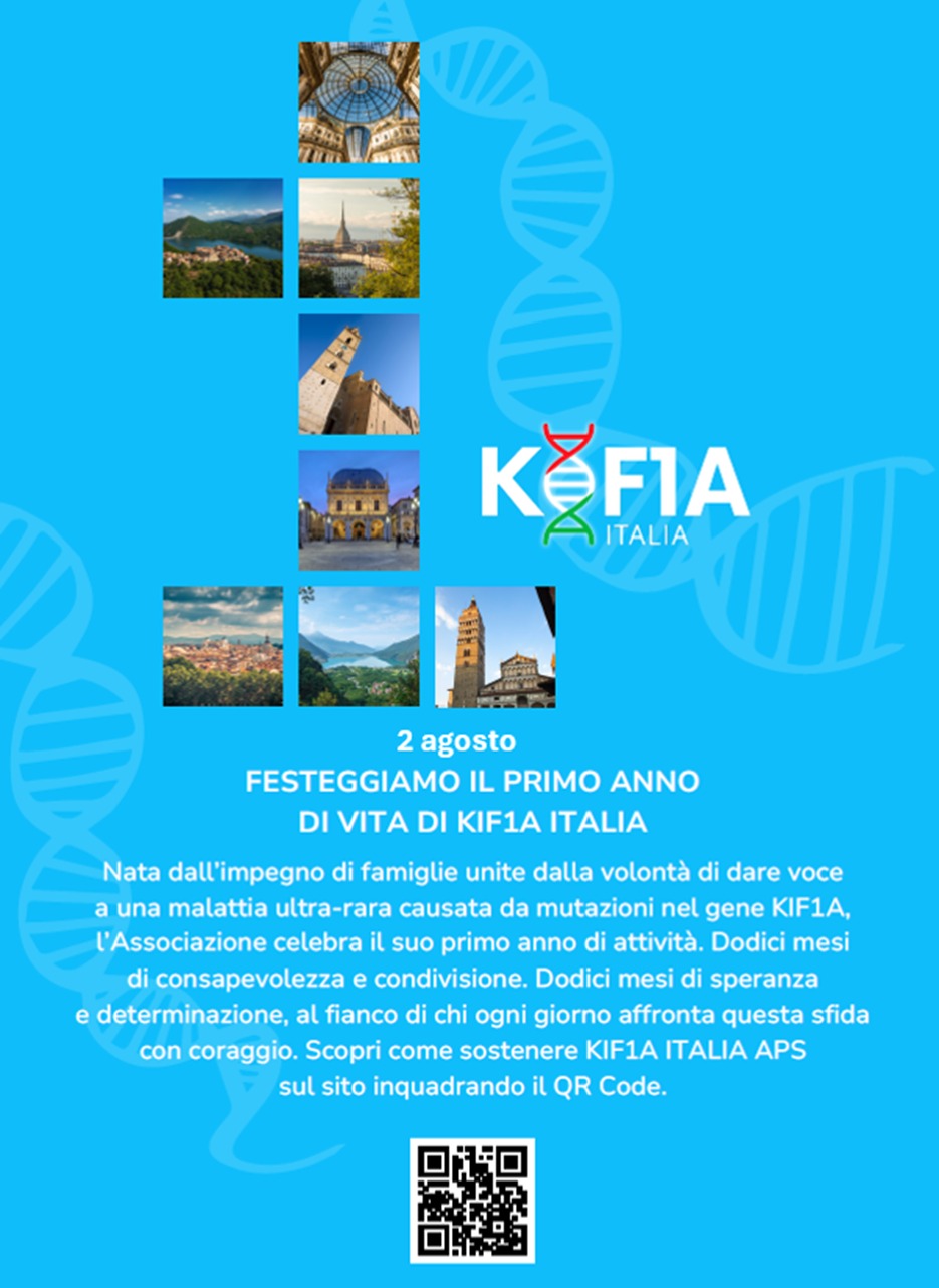 Fondata il 2 agosto 2024, KIF1A ITALIA APS è la prima associazione nazionale interamente dedicata alle persone affette da KAND. L’organizzazione si impegna a promuovere la ricerca, costruire reti di sostegno per le famiglie e lottare per il diritto alla diagnosi, all’informazione e soprattutto alla speranza di una cura.