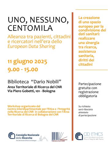 Il workshop “UNO, NESSUNO, CENTOMILA. Alleanza tra pazienti, cittadini e ricercatori nell’era dello European Data Sharing” è organizzato dal Centro Interdipartimentale per l’Etica e l’Integrità nella Ricerca (CID Ethics) del Cnr in collaborazione con l’Area Territoriale di Ricerca del Cnr di Bologna.